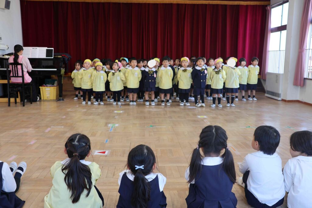 毎週、練習を見に来ている年長組が「前より歌が揃ってる!」と感心をしていました!「もっと良くなるにはどうしたら良いかな?」と聞いてみると「綺麗な声だともっと良いよ!」というアドバイスを貰い、さらに良くなるよう一生懸命練習を行っています!当日、沢山の参加お待ちしています🎄🎀