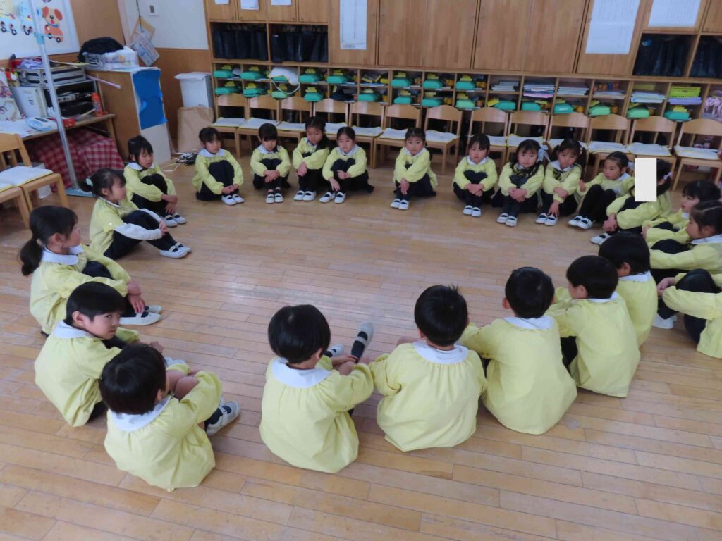 みずほ幼稚園では、クラスの皆で丸く座って一つのことを考えて話す時間をとっています。