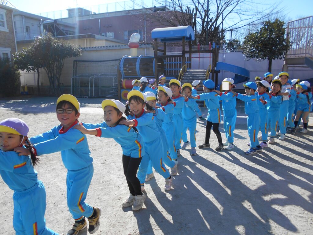 外遊びが終わり保育室へ戻る前、年長の担任の先生を先頭に「年長組列車」ができました♪
