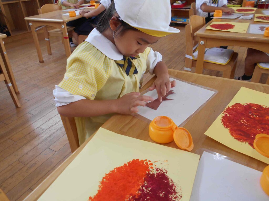 筆を使うのとはまた違った楽しさがあり、何度もなんどもスタンプをしていました♡すると・・・あっという間に綺麗な紅葉が完成しました✨