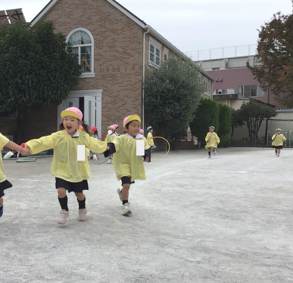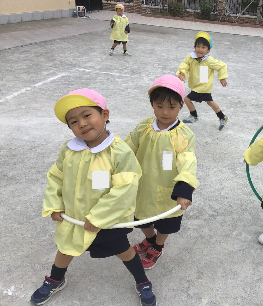 入園当初は一人で遊ぶことが多かった子も今ではお友達と手をつなぎ、おにごっこをしたり、フラフープを使って電車ごっこをできるようになりました!!