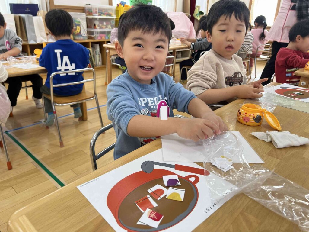 ハサミで切った野菜やお肉をカレーの鍋に貼りあわせ、美味しそうなカレーを作りました!